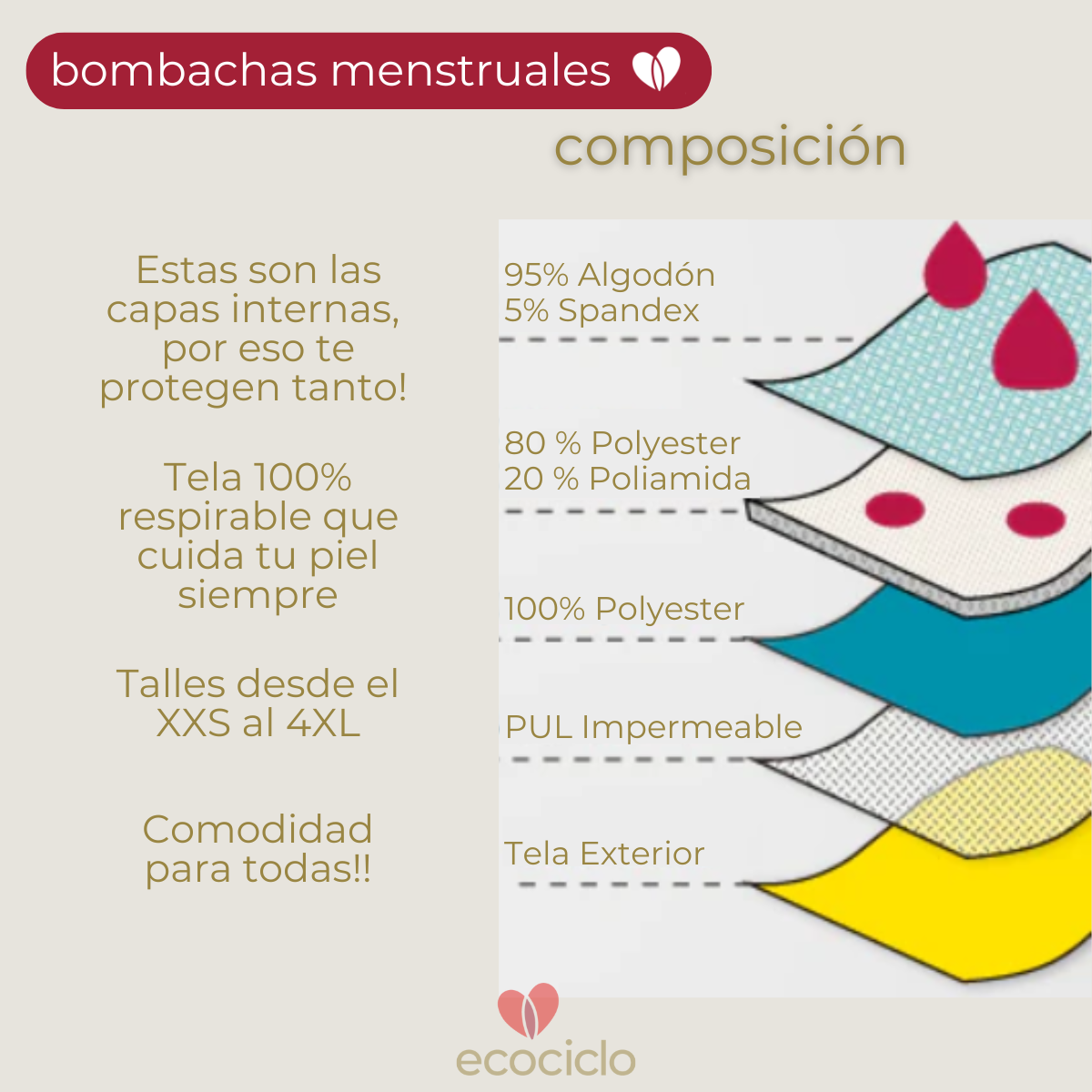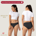 Bombacha para usar durante los días de período, tiene una capa absorbente y una protección impermeable antifugas. Es ideal para complementar la copa menstrual, toallitas femeninas o para usar sola los días de poco flujo.