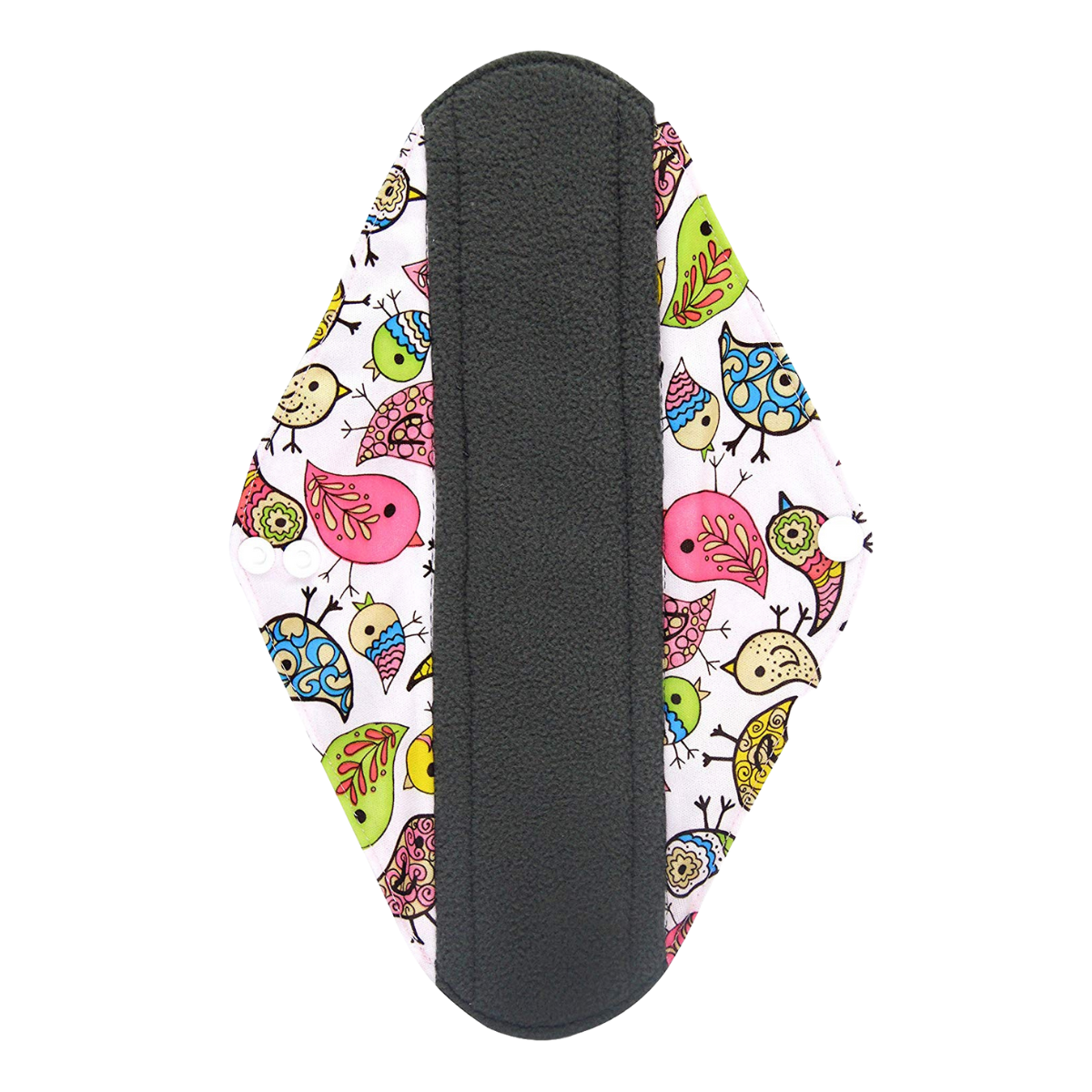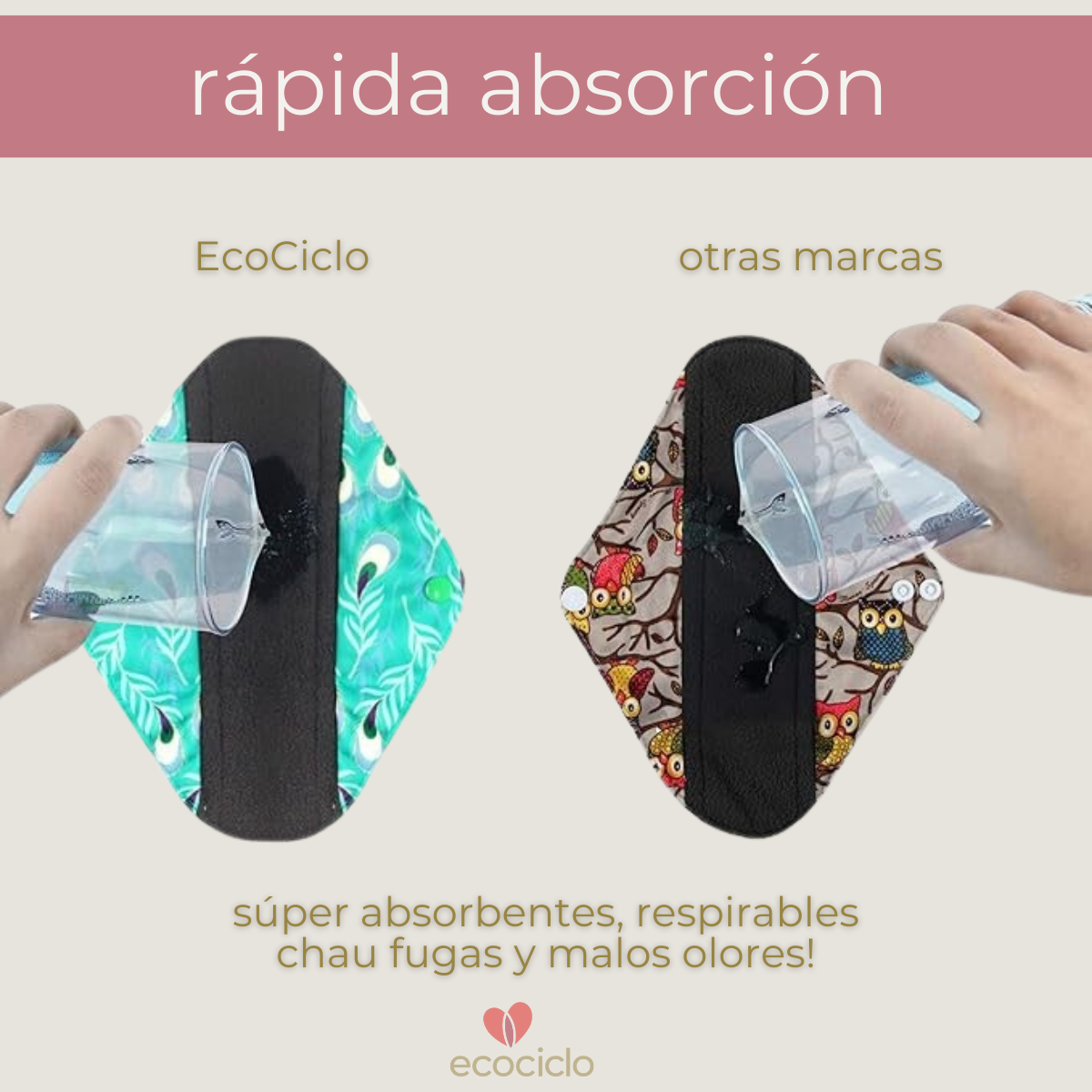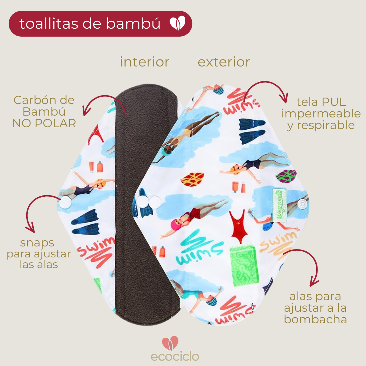 La tela exterior es impermeable y respirable (PUL), la tela interior NO ES POLAR, es carbón de bambú, naturalmente antibacteriano y super absorbente. Las alas con broche a presión sirven para ajustar en la ropa interior. Funcionan igual que las descartables solo que en lugar de tirarlas, las lavamos y volvemos a usar.